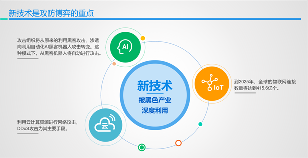 新技术推动数字化转型的同时,也会为黑产所利用。近些年来,随着云计算、物联网、人工智能的快速发展,使得这些技术和基础设施可以作为企业业务系统的资源,极大的提高企业的生产效率。但是,它们也为黑产进行网络攻击提供了技术支撑,例如,云计算的大量运算能力可能会被用来发起DDoS攻击;会有一定比例的海量物联网终端可能被黑客控制做为“肉鸡”;人工智能技术也可能被用于自动化攻击工具的开发,形成AI黑客机器人。在这种情况下,依赖人工去处理大量的攻击事件是不现实的。因此,未来网络安全技术与人工智能技术结合,制造AI防御机器人对抗AI黑客机器人进行防御将是一种必然的趋势。
