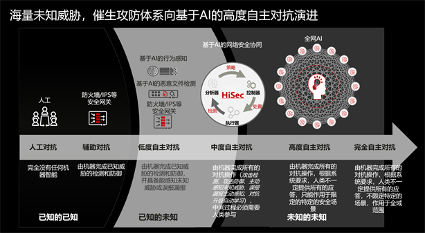 这个过程可以分为三个阶段。首先,对于人们已知的威胁,通过安全防御设备加上人工处理对抗威胁。其次,对于人们已经理解的未知威胁,可以逐渐演进为低度的自主对抗,通过AI技术的加持,从单点防御方面进行一些检测能力的增强,从而能够覆盖未知威胁进攻。可以针对某个具体业务场景,从预防、检测、到威胁处置进行完全闭环的操作,实现一定程度智能、自动化。最后,对于未来的未知威胁,能完全做到这种机器自主对抗,实现在全领域、全方位对抗安全威胁。这将是一个逐步演进的过程。