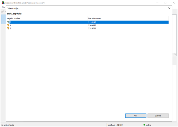 每个密钥槽都用独特的加盐加密保护,这使得反向暴力破解(将相同的KDF密码与不同的槽匹配)是不可行的。在破解过程中,必须为每个密钥槽分别计算KDF。因此,恢复密码以保护LUKS设备需要选择要破解的密钥槽。破解密码时,设置攻击时使用Elcomsoft Distributed Password Recovery执行此选择。