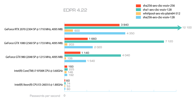 虽然LUKS通过在密钥生成过程中使用数千次哈希函数迭代来提供强大的保护,以防止暴力破解,但与过去相比,我们在密码恢复破解方面有了长足的进步。由于GPU加速、分布式和云计算的使用,强制输入密码的速度大大加快。通过Elcomsoft Distributed Password Recovery,最多可使用10000台计算机和按需云实例来破解单个密码。