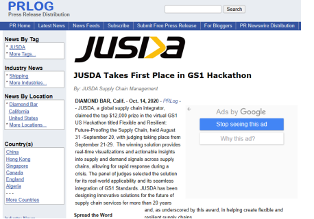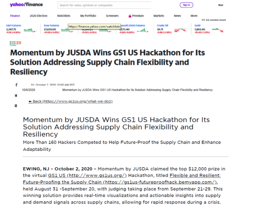 美国时间2020年10月2日,准时达于美国的全资子公司美国准时达(JUSDA America)在虚拟GS1美国黑客马拉松大赛中斩获头奖。该项赛事于8月31日至9月20日举行,以“灵活和弹性:面向未来供应链”为主题,最终,准时达凭借智慧供应链可视化追踪和可执行预判方案拔得头筹。评审团认为,准时达的智慧供应链能实现供应链管理中的全程可视化追踪,及时发现异常,实现对风险的提前干预,以保证供应链健康有序的运行,这恰好与GS1标准倡导的精神相契合。