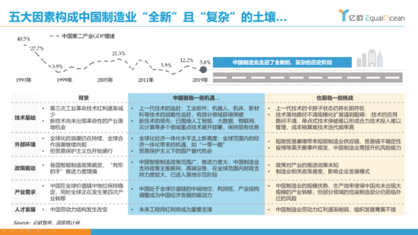 回看中国,中国制造业的未来面临着更大的不确定性。2016年至今,中国第二产业GDP增速下降至个位数,技术基础、外部环境、政策驱动、产业需求、人才发展五大因素构成中国制造业“全新”且“复杂”的土壤。