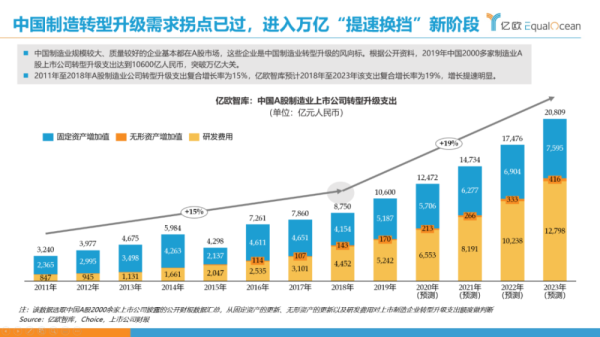 根据亿欧智库测算,中国2000多家制造业A股上市公司转型升级支出达到10600亿人民币,突破万亿大关。2011年至2018年A股制造业公司转型升级支出复合增长率为15%,这一数值在2019至2023年将达到19%,中国制造转型升级需求拐点已过,进入万亿“提速换挡”新阶段。