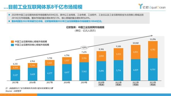 根据亿欧智库的测算,2020年中国工业互联网体系市场规模为8304亿元,其中以工业网络、工业传感、工业软件、工业云以及工业互联网安全为主的核心领域达到2810亿元市场规模,并整体有望在2022年突破万亿大关。