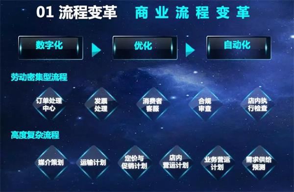 第一方面是商业流程变革,目的是把现在的商业流程变得更高效、更智能。