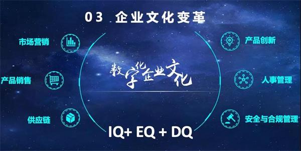 第三方面是企业文化变革。数字文化牵扯到所有部门,公司的每一个部门都需要有一个数字化的文化,在这个过程中我们以前讲一个商业的领导,他需要具备IQ、EQ,我们提出来现在新型的企业领导,他需要具备DQ,就是数商,他必须有足够的数商能够理解这个数字化变革的意义,能够拥抱数字化变革,引领数字化变革,他才能成为一个真正的合格的未来的领导者。所以企业文化变革是我们非常注重的一个变革的方向。