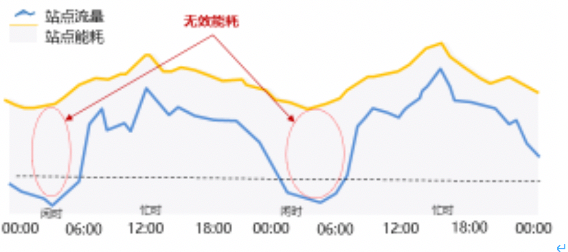 如上图,即使在闲时低流量时间段,站点能耗并不随着流量下降而同步下降,仍然居高不下,这意味着站点在闲时会产生无效功耗。