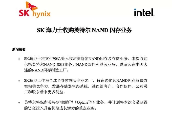 SK海力士和英特尔共同宣布签署收购协议,SK海力士将以90亿美元全现金的方式收购英特尔的NAND闪存及存储业务,双方期许在2021年底前取得所需政府机关的许可,并于2025年3月份完成最终交割。