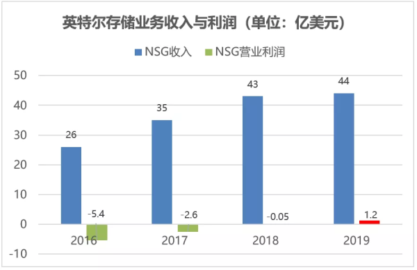 从营收来看,英特尔在此领域的市场收入也并不稳定。根据财报显示,英特尔非可变存储解决方案业务自2016年以来一直处于持续亏损状态,2016年到2018年分别亏损5.4亿美元、2.6亿美元和500万美元,直至2019年才开始盈利1.2亿美元。