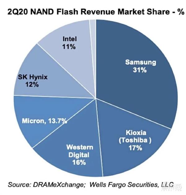 从市场份额来看,NAND市场由三星牢牢把持,占据主导地位,在三星、铠侠、西部数据、美光、SK海力士和英特尔为主的六家企业中,英特尔仅以11%的份额,屈居末位。而且在这六家中,除了英特尔外,其他企业均把存储业务作为主要业务或主要盈利点,只有英特尔的存储业务不是主营业务,且营收占比也不高。