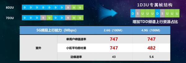 中国移动研究院副院长黄宇红表示,在2.6GHz(100MHz带宽)和4.9GHz(100MHz带宽)频段上采用时隙配比为1D3U的专属帧结构后,增加了TDD频谱上行资源占比,测试结果显示,上行单用户峰值速率可达到747Mbps,小区容量可达到482-747Mbps。目前网络、芯片等多个厂家已支持1D3U的帧结构配置,已在宁波舟山港进行了试点,预计明年初可商用。