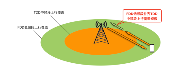 基站发射功率大且支持Massive MIMO技术,在下行方向可以将无线电波传送到很远的距离,但手机发射功率很小,上行覆盖受限,是基站覆盖的短板。现在有了SUL,5G TDD中频段(比如2.6GHz、3.5GHz或4.9GHz)可以聚合覆盖能力更强的FDD低频段(比如1.8GHz)作为上行补充。当手机处于TDD中频段覆盖范围时,手机使用TDD中频段;当手机移动到TDD中频段覆盖范围之外时,手机在上行方向采用FDD低频段,这就补充了TDD 中频段的上行覆盖短板,延伸了覆盖范围。