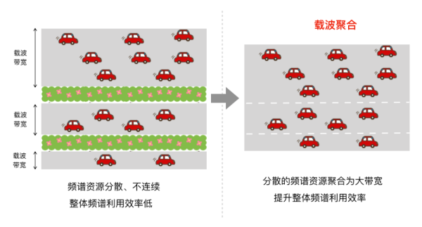 单载波最大带宽限制了网络的最大速率,而运营商的频谱资源过于分散导致了整体频谱利用率偏低。怎么办呢?