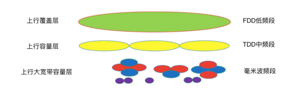 随着5G网络不断发展,重耕2/3G低频段以及商用毫米波成为必然趋势,未来可通过低频段、中频段和毫米波多频段组网的方式,比如用700MHz/800MHz/900MHz/1800MHz等低频段作为覆盖层,2.6GHz/3.5GHz/4.9GHz等中频段作为容量层,26GHz/28GHz毫米波作为大带宽容量层,来协同提升上行容量和覆盖。