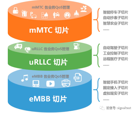 经过无线、承载、核心网纵向子切片的协同工作,为端到端的横向切片:eMBB、mMTC和RLLC提供服务支撑,不同的业务可以在不同的切片上进行。
