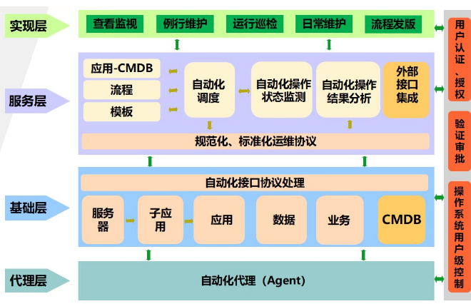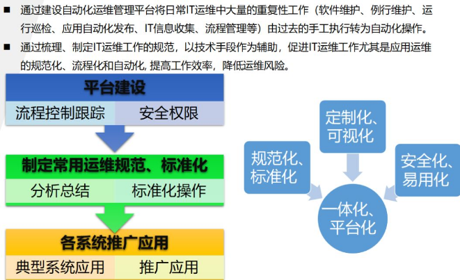 制造自动化、办公自动化除了技术升级改造外还有关键的规范化标准化工序或元件,要实现自动化运维也同样离不开运维操作和流程的规范化标准化,自动化运维平台建设必须与运维规范标准化相辅相成。