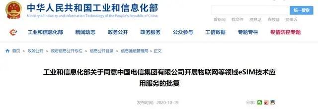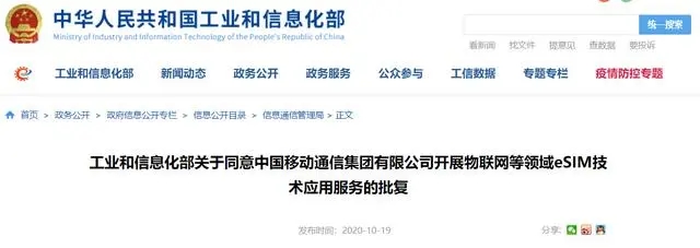 近日,工信部官网公告,同意中国移动、中国电信开展物联网等领域eSIM技术应用服务,但仅限开通数据业务和与之相关的定向话音、定向短信业务。同时,工信部要求,应严格遵守号码管理相关要求,仅可使用13位物联网号码开展物联网等领域eSIM技术应用服务;运营商仅可在自有渠道办理物联网等领域eSIM技术应用服务,与转售企业合作提供相关服务须另行申请。