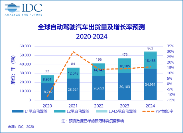 IDC对L1-L5级自动驾驶汽车全球市场在2020-2024年的发展预测如下: