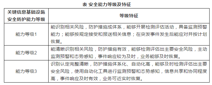 关键信息基础设施安全防护能力依据5个能力域完成程度的高低进行分级评估,包括3个能力等级,从能力等级1到能力等级3,逐级增高,能力等级之间为递进关系,高一级的能力要求包括所有低等级能力要求。