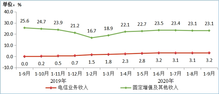 图2 2019-2020年1-9月电信业务收入分类增长情况