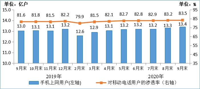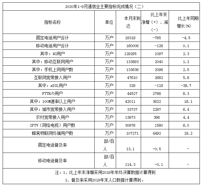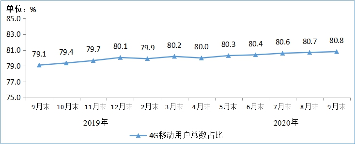 移动电话用户规模达16亿户,4G用户占比持续小幅增加。截至9月末,三家基础电信企业的移动电话用户总数达16亿户,同比增长0.1%。其中4G用户数为12.93亿户,同比增长2.3%,在移动电话用户总数中占比为80.8%,占比较上年末提高0.7个百分点。