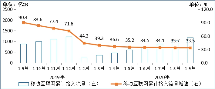 图6 2019-2020年1-9月移动互联网累计接入流量及增速情况