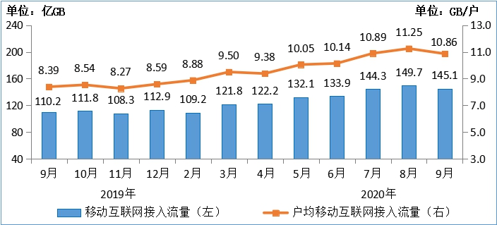 图7 2019-2020年9月移动互联网接入月流量及户均流量(DOU)情况