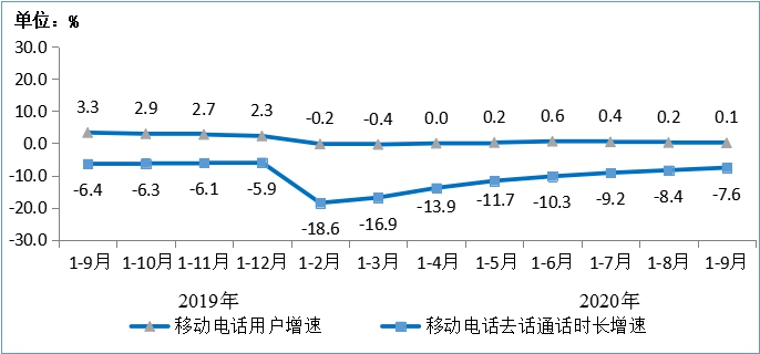 图8 2019年-2020年1-9月移动电话用户增速和通话时长增速