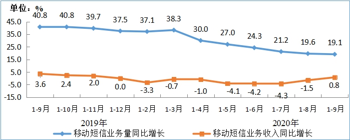 图9 2019-2020年1-9月移动短信业务量和收入同比增长情况