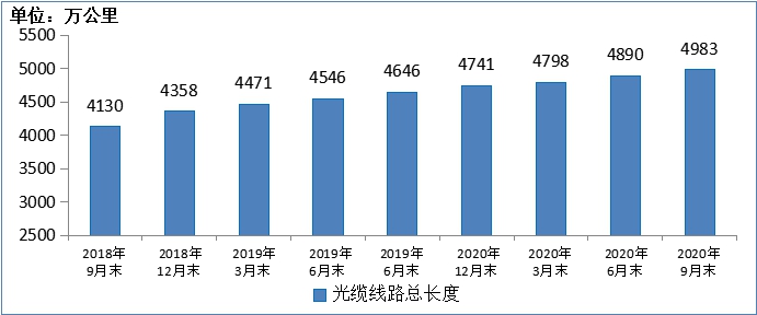 图11 2018-2020年9月末光缆线路总长度发展情况