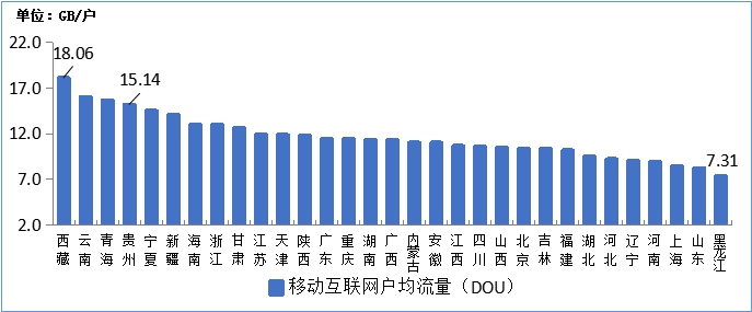 西部地区移动互联网接入流量增速领先。前三季度,东、中、西和东北地区移动互联网接入流量分别达到498亿、259亿、361亿和66.4亿GB,同比增长28.7%、35.2%、40.4%和28.1%,西部地区增速领先全国。西藏、云南、青海和贵州4省的9月当月户均移动互联网接入流量(DOU)超过15GB/户;各省DOU值最高值与最低值之差为10.75GB/户,差值较去年同期扩大4.84GB/户。