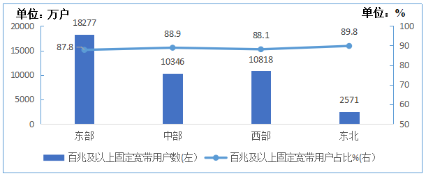 东北地区百兆及以上固定宽带接入用户渗透率领先。截至9月末,东、中、西和东北地区100Mbps及以上固定宽带接入用户分别达到18277万、10346万、10818万和2571万户,占本地区固定互联网宽带接入用户总数的比重分别为87.8%、88.9%、88.1%和89.8%,东北地区占比领先全国。各省百兆以上固定宽带接入用户最高占比与最低占比之差为17.2个百分点。