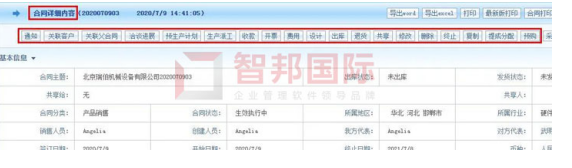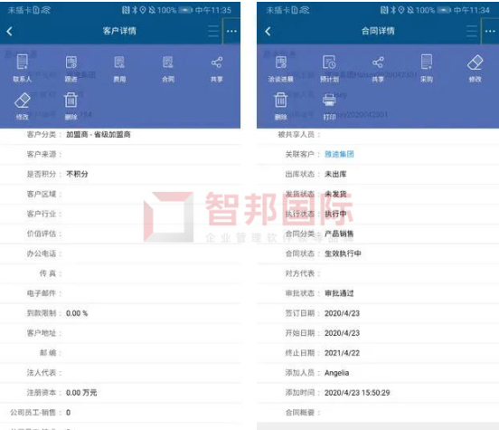 智邦国际机械设备行业ERP系统移动端客户、合同一键生成关联业务