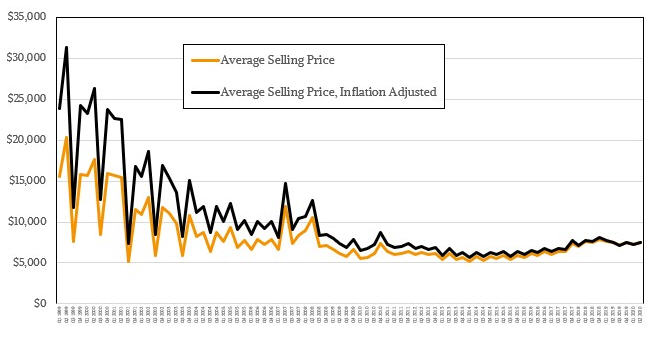 上图的2019年到2020年服务器的销售价格下跌与内存和闪存价格的下跌有关,目前服务器的CPU、内存和闪存的价格已经趋于合理稳定。这不能完全显示几十年来的销售价格,因此这张图表是从1999年第一季度到2020年第二季度的价格图表,其中包括所有类型的服务器以及原始销售价格和通货膨胀调整后的销售价格。如果要在这么长的时间内进行比较,则需要考虑美元随时间的贬值情况,例如下图。