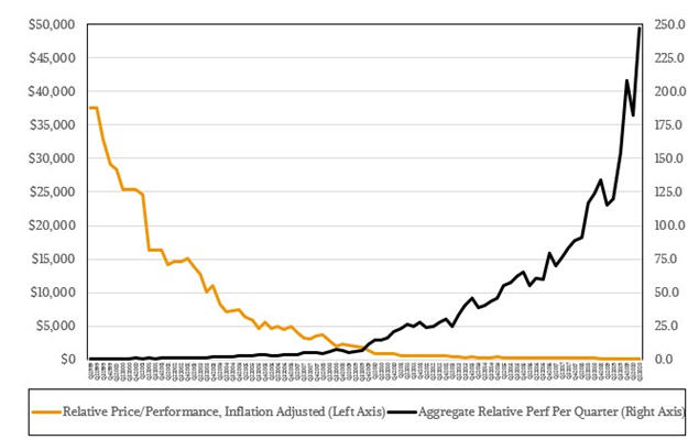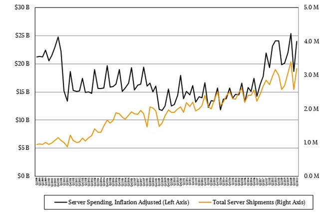 自从1999年以来,服务器的成本大幅下降,当时许多RISC/Unix和IBM大型机正在大量销售,而且每季度销售的服务器数量增长了4倍左右。当将每台CPU的计算容量加到这个等式中,2020年第二季度的服务器总销售量是1999年第一季度的437倍,按通货膨胀调整之后的美元计算,增加了370倍。从模型来看这是一个长远的观点,而这些模型又基于IDC公司产生的出货量和收入数据: