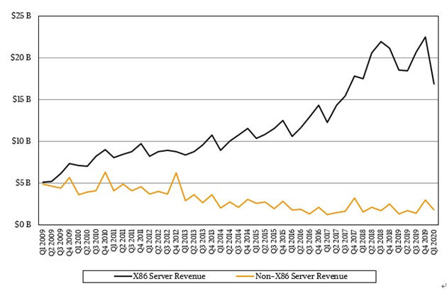 基于X86架构的服务器(包括基于Intel Xeon SP和AMD Epyc处理器的服务器)销售额为216亿美元,2020年第二季度增长了17.4%,而基于其他处理器架构服务器的销售额增长了47.4%,达到24亿美元。后者的增长主要归功于IBM公司在System z15大型机上的销售,但是基于Arm的服务器也有所增长,这也有所帮助。IBM公司2020年第二季度Power Systems和System z iron服务器的销售额为14.5亿美元,同比增长22%,占到非X86服务器市场的58.6%。这个数字比平均值低一点,这是因为Power9处理器在几个季度前进入了其周期的长尾。
