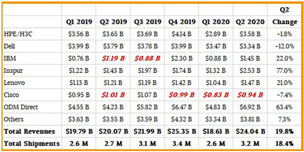 从供应商的角度看IDC公司的调查数据,还有一些事情要做。下面这个表格的最右列显示了2020年第二季度的季度变化,红色粗体部分为估算值: