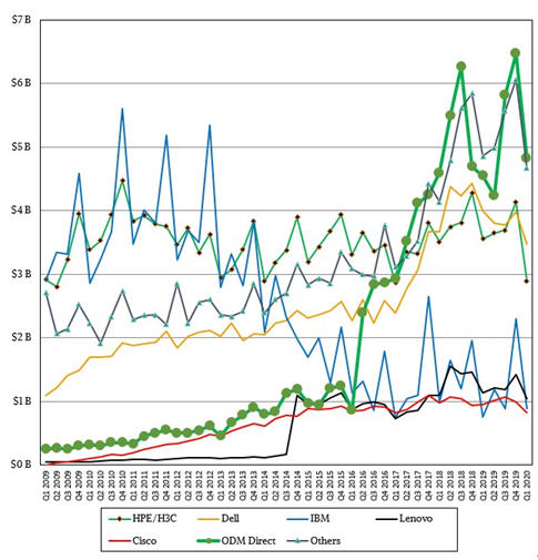 与过去一样,2020年第二季度服务器中端市场表现不如高端和低端服务器。对于低端服务器,其价格为25,000美元或更低,市场收入增长了22.1%,达到187亿美元,占据了服务器市场的绝大部分。而价格在25,000美元至250,000美元之间中端服务器市场下降了五分之二,达到33亿美元。这仍然是一个重要的市场,尤其是对于使用RISC以及有时将大型机作为关键任务后端记录系统的客户而言,但是相对于其他市场,这种市场一直在缩减。高端服务器市场的销售增长了44.1%,达到19亿美元,其中包括基于Xeon、Power、Systemz motors的NUMA服务器。