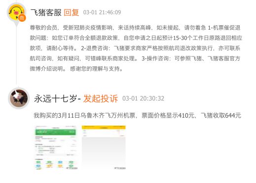 比如在商旅平台飞猪上,网友“永远十七岁”就投诉称,3月11日乌鲁木齐飞万州的机票,票面价格显示410元,但是飞猪却收取644元,而飞猪客服的回复却避而不谈价差的问题。