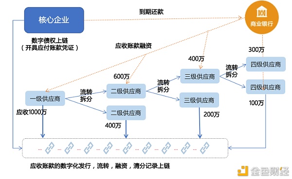(3)融资申请:在核心企业确认的前提下,已经形成应收账款的1级供应商,可以向金融机构申请融资,或者将已确权的应收账款拆分给2级供应商。