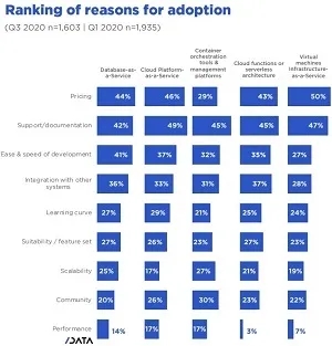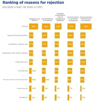 “仔细看一下数据就可以看出这种情况的真实程度——对于DBaaS和IaaS,开发者因为价格而拒绝的可能性最高,是第二和第三位的支持/文档以及学习曲线的两倍多。