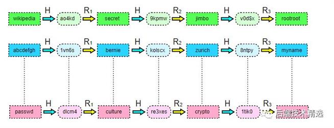 在这个例子里面,空间不够,那就多花一些时间。在彩虹表中,可以将全部的sha256值转化为长度相同的若干条hash链,只保存hash链的头和尾,在破解的时候先查询得到sha256存在于哪条hash链中,然后计算这一条hash链上的所有sha256,通过实时比对来破解用户密码。