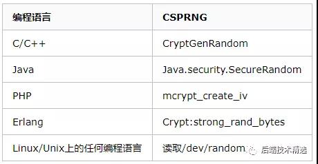 CSPRNG跟普通的随机数生成算法,比如C语言标准库里面的rand()方法,有很大不同。正如它的名字所揭示,CSPRNG是加密安全的,这意味着用它产生的随机数更加随机,且不可预测。常见编程语言都提供了CSPRNG,如下表: