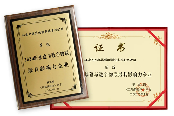 2020年10月22日,由赛迪网、《互联网经济》杂志主办,赛迪呼叫等共同发起的“2020行业信息化竞争力成果”重磅发布。中海昇物联凭借在技术创新、应用落地以及推动基础施工行业数字化转型方面的优秀表现,被评为“2020新基建与数字物联最具影响力企业”称号。