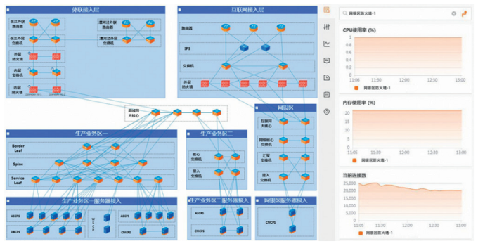 网络是一张四通八达的公路网,将各个计算、存储节点互联起来。当其承载的应用发生异常时,究竟涉及哪些网络节点,相互关联的其他IT资源又有哪些,状态及性能情况怎样,如何快速定位复杂的故障原因,运维人员往往无的放矢。2020年,我们理顺了网络资源与各类IT资源、应用节点间的关联关系,实现了应用级网络配置信息的直观展现。应用级可视化能够从应用的视角直观地展现应用节点与直连交换机的关联关系,应用使用的广域网线路、负载均衡、HTTPS加解密等各类网络资源,以及应用内部交互途经的网络设备等各类信息,如图1所示,是网络运维人员与系统、应用、设备等运维团队的沟通桥梁。特别在生产抢修场景中,应用级可视化能够帮助运维人员快速了解故障应用涉及的网络资源,针对性地组织排查,是提升排障质效的关键工具。