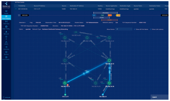 交换机的封装远程端口镜像(ERSPAN)提供了一种折中的解决方案,该方案通过交换机直接将流量数据收敛至TCP链接级,虽然降低了一部分流量分析的颗粒度,但大大提升了流量分析实现的性价比。工具能够产生全网的TCP流量全景视图,展示数据流走向、时延等信息,如图2所示,帮助网络运维人员快速洞察全网服务质量,识别异常流量,辅助故障定界。