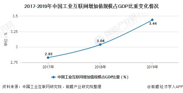 2017-2019年我国工业互联网增加值规模占GDP比重呈逐年增长态势,2019年我国工业互联网增加值规模占GDP比重为3.44%,较2018年上涨了0.4%。