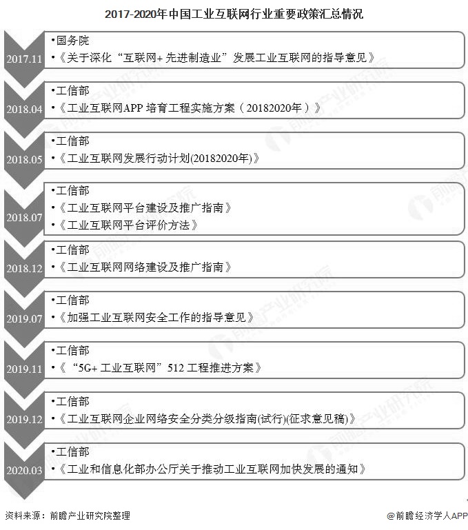 我国高度重视工业互联网发展。2017年11月,国务院发布《关于深化“互联网+先进制造业”发展工业互联网的指导意见》,打造网络、平台、安全三大体系,推进大型企业集成创新和中小企业应用普及两类应用,构筑产业、生态、国际化三大支撑等7项任务。2020年2月,中共中央政治局会议强调,推动生物医药、医疗设备、5G网络、工业互联网等加快发展。