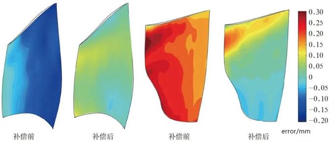 相对于传统的数控加工,智能加工技术以数字孪生为核心、以加工过程大数据及其挖掘方法为支撑,采用无扰嵌入式多源感知和图形处理器(GPU)高性能技术相结合的方法建立关键构件加工过程的数字孪生模型,形成人工经验知识的数字化集成途径,有望带动关键构件加工领域人类知识与机器知识的高度融合以及机器知识的爆发式增长,从而实现复杂关键构件制造品质的跨越式提升。图4显示了叶片叶盆面与叶背面开展智能加工前后误差分布对比情况。