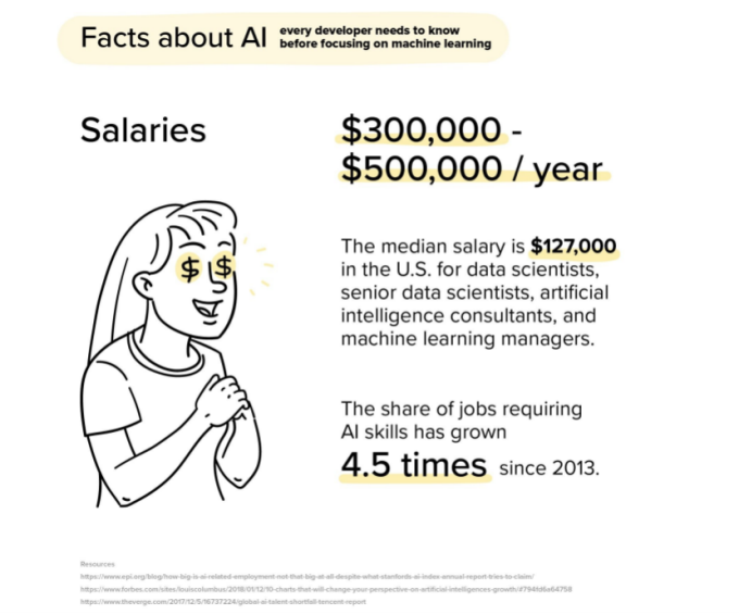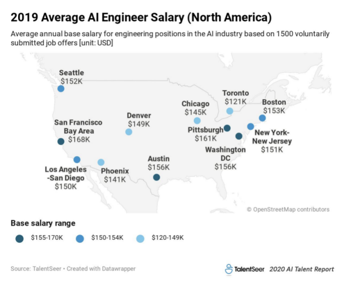 无论在任何行业中,就业市场的稀缺性必然会带来可观的薪水。例如,据报道,2014年被谷歌以6.5亿美元收购的DeepMind在400名员工身上花费了1.38亿美元。《纽约时报》对该公司最近在英国公布的年度财务报表进行了研究,发现其员工基本年薪在30万至50万美元之间。